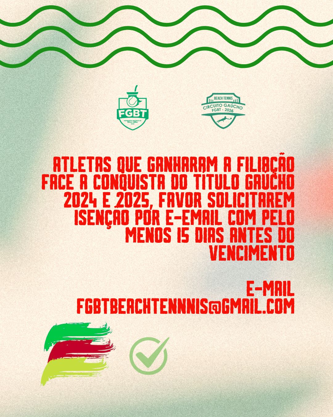Atletas que ganharam a filiação como prêmio devido aos títulos gaúchos de 2024 e 2025, favor solicitarem por e-mail com pelo menos 15 dias de antecedência já que não é automática a renovação.